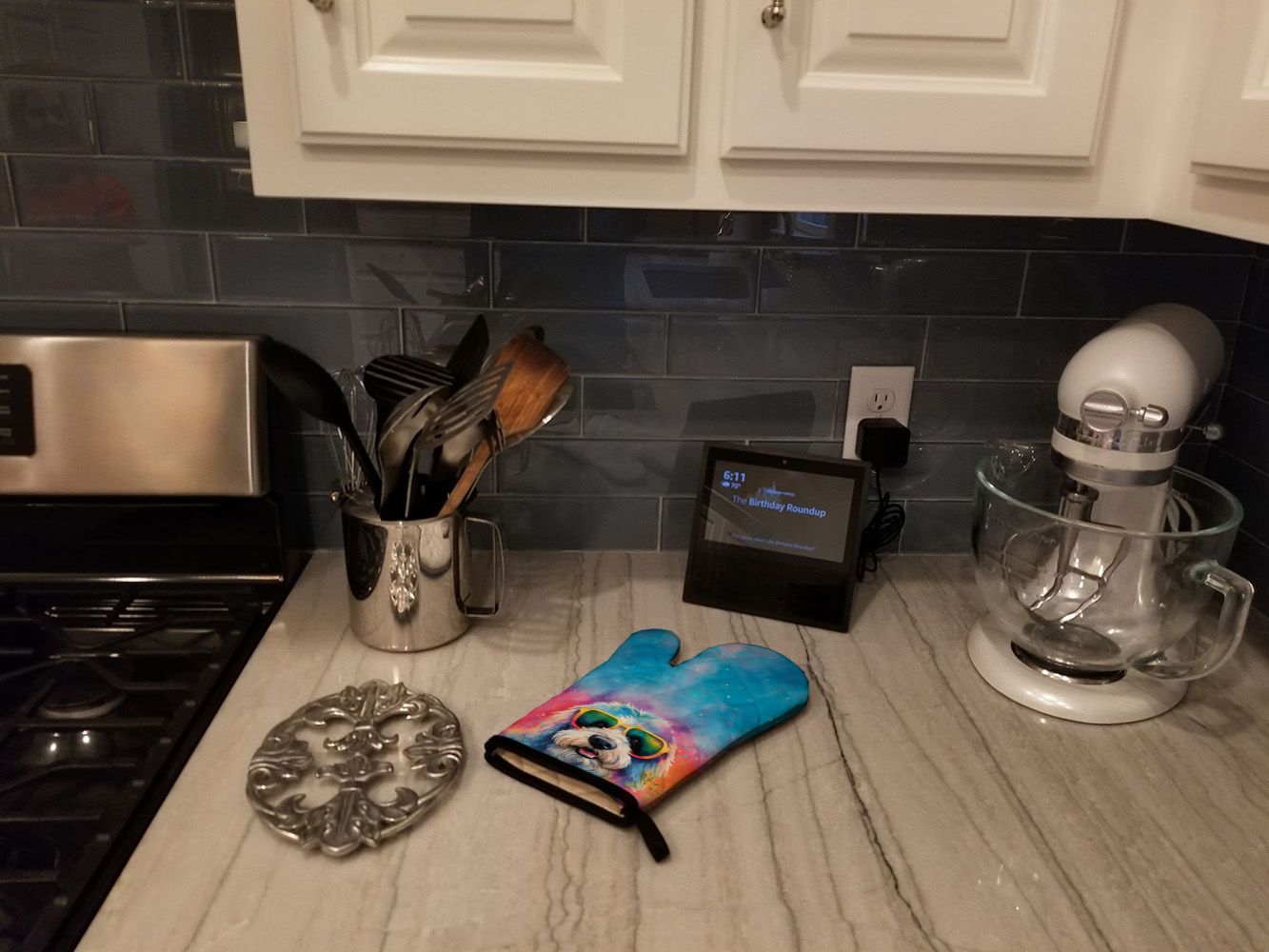 Oven Mitt featuring breed specific Old English Sheepdog artwork. Presenting our Large Right Hand Thick Heat Resistant Oven Mitt, an indispensable tool for any culinary enthusiast. This mitt boasts layers of quilted protection on both sides, providing outstanding resistance against extreme heat. Embellished with beautifully printed artwork, it adds an extra dash of charm to your kitchen decor. At about 12 inches long and 8 1/2 inches wide, this oven mitt offers a generous fit, accommodating a diverse range of hand sizes. Its design is enhanced by a sleek Black bias tape trim, finished with a convenient hoop for easy hanging. Fresh out of the packaging, the quilting process may give the mitt a stiff feel, but rest assured, it will soften with use and washing. Our mitt is crafted with a unique center fabric, Insul-Bright, a composite material made from polyester fibers, needle-punched through a nonwoven substrate and a reflective metallized film. This smart material resists both conduction and radiant energy, reflecting heat back to its source, all while remaining breathable. Our oven mitt is machine washable and safe for tumble drying. It's a perfect gift for your favorite Chef, BBQ enthusiast, or just a little treat for yourself! Experience safety, style, and convenience rolled into one with this exceptional oven mitt.