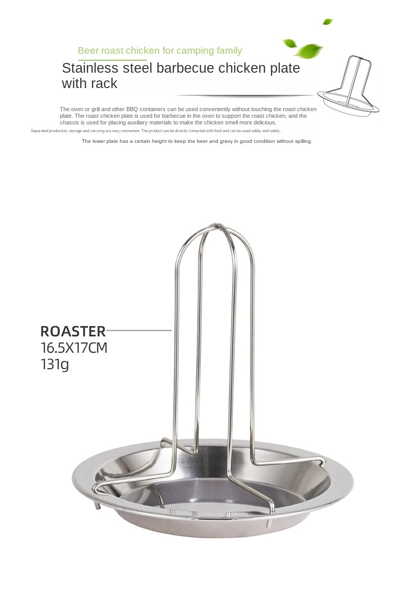 Roast chicken tray is used for roasting and supporting the roast chicken in the oven, and the chassis is used to put the auxiliary materials and to smoke the flavor effect inside the chicken in order to achieve better taste. This product is processed by stretching, stamping, surface photometric treatment and other technologies, then after strict inspection, on the packaging, exported to many countries, very high cost performance, quality assurance.