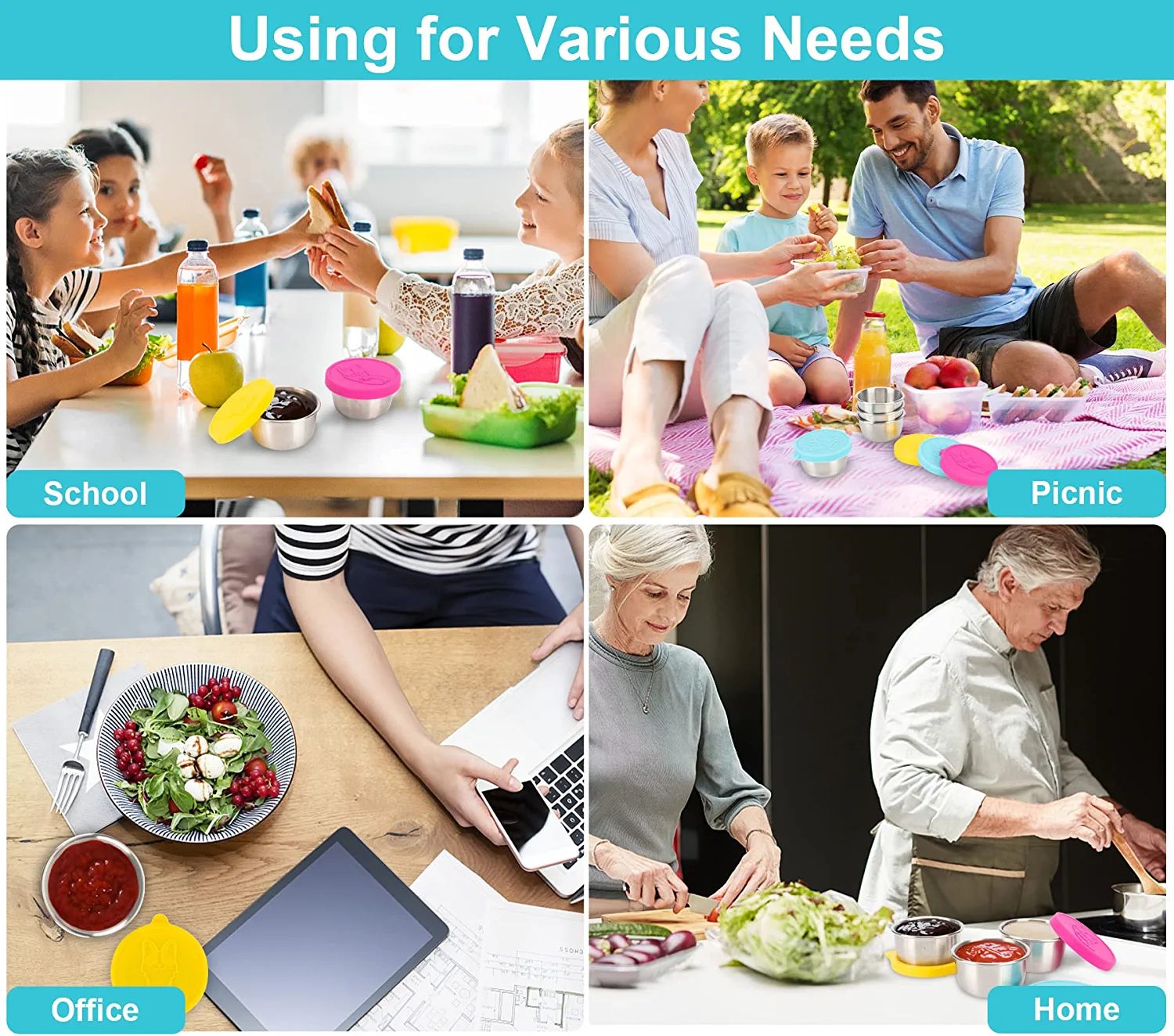 [No More Spills]The improved sealing mechanism enables our silicone lids not only very easy to put on and take off; but tight enough to keep the kids food containers sealed; no more leaks or spills. So much easy to add deliciousness to your lunch.